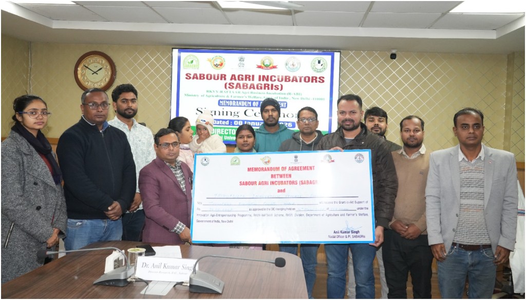 Bhagalpur: Bihar Agricultural University’s (BAU) Sabour-based incubator, SABAGRIs, has signed a Memorandum of Agreement (MoA) with five agriculture-focused startups, marking a major step in promoting innovation and entrepreneurship in the state’s farming sector. The startups have been granted financial support of Rs 50 lakh under the Rashtriya Krishi Vikas Yojana – RAFTAAR (RKVY-RAFTAAR), with an initial tranche of Rs 32.5 lakh set to be released shortly.
