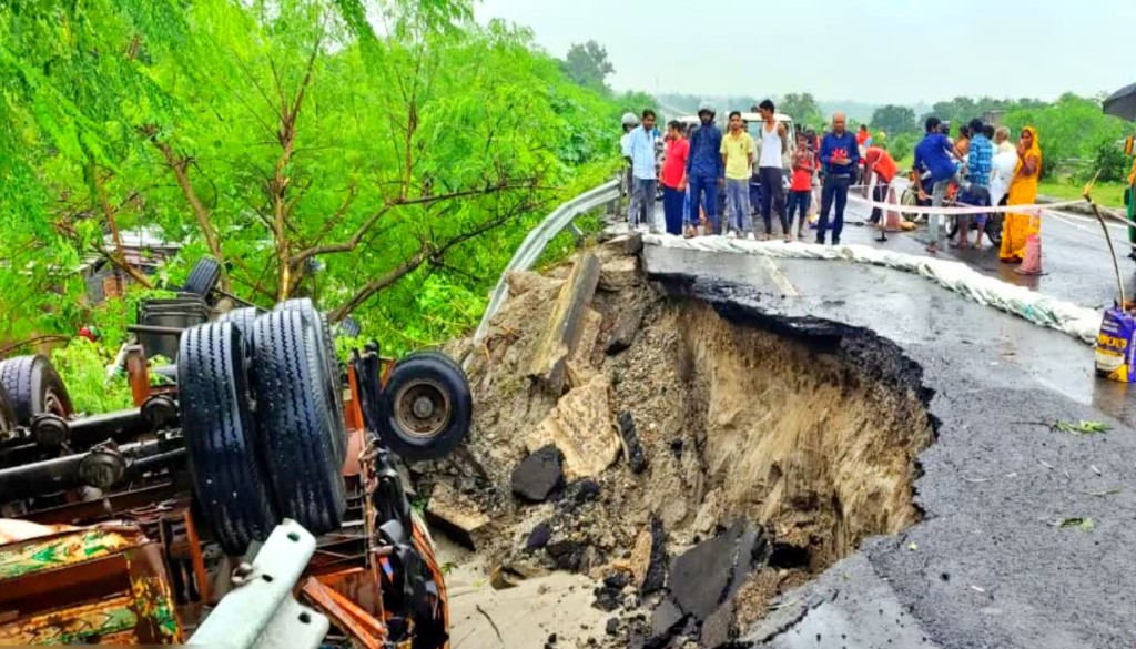 Araria: Continuous rainfall in Bihar has caused sections of major roads to cave in, disrupting traffic and raising concerns over infrastructure maintenance. On Saturday night, half of the Araria-Narpatganj stretch of National Highway 27 collapsed, leaving a truck overturned in a roadside ditch. No casualties were reported.
