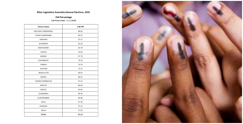 Patna: Bihar witnessed massive voter participation in the final phase of the 2025 Assembly elections on Tuesday. By 5 pm, a turnout of 67.14% was recorded, showing the strong enthusiasm of voters across the state. The last phase of voting covered 122 assembly seats across 20 districts, deciding the fate of 1302 candidates, including 12 ministers.