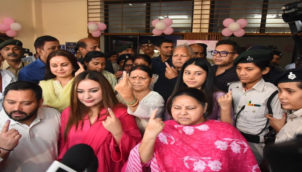 The entire Yadav family — including Lalu Prasad Yadav, Rabri Devi, Misa Bharti, and Tejashwi Yadav with his wife Rajshree Yadav — voted at different booths in Patna. Tejashwi, who cast his ballot at the Veterinary College booth, said that the election was about jobs, education, and development.