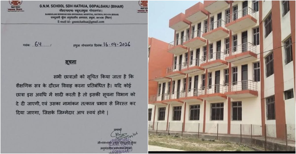 The notice, reportedly displayed on April 14 at a General Nursing and Midwifery (GNM) school on the campus of Hathua sub-divisional hospital in Gopalganj district, stated that marriage during the academic session was prohibited. It warned that any student who married would have her enrolment cancelled with immediate effect and would be “solely responsible” for the consequences.