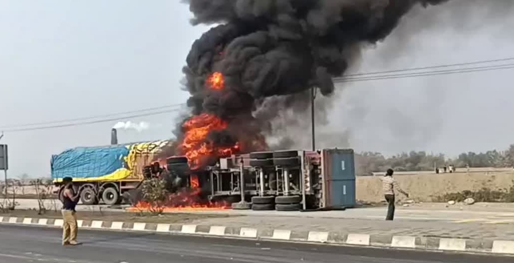 The accident took place under the Thakurganj police station area when the two heavy vehicles, travelling from opposite directions, rammed into each other. Eyewitnesses said flames rose high into the air, creating panic at the scene and forcing authorities to temporarily halt traffic on the busy highway.
