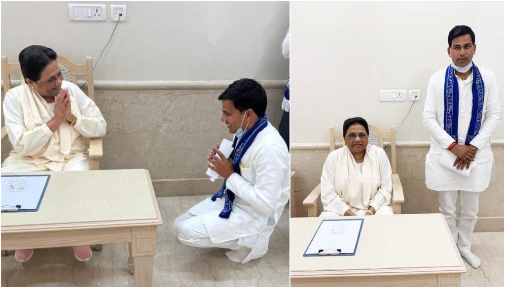 Patna: In a striking display of deference, Bihar’s lone Bharatiya Samaj Party (BSP) MLA, Satish Kumar Singh, also known as Pintu Yadav, met party supremo Mayawati in Delhi on Wednesday. Photographs from the meeting, released by a BSP fan page, show Singh kneeling before Mayawati with folded hands, having removed his shoes, while the former chief minister smiled in response.
