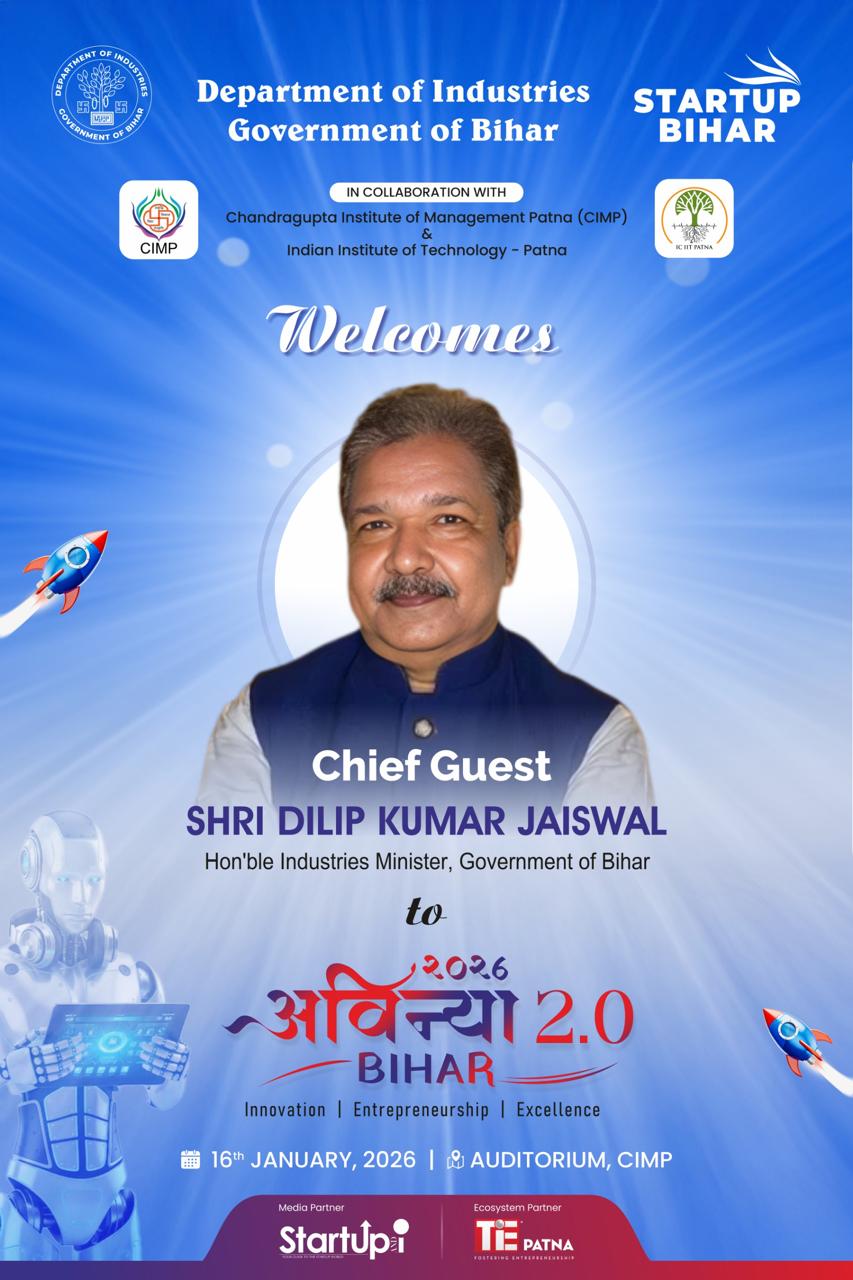 Patna: National Startup Day celebrations to be hosted in Patna on January 16, 2026, as the Chandragupt Institute of Management Patna (CIMP) becomes the venue for Avinya Bihar 2.0, an event aimed at showcasing the state’s expanding role in India’s startup landscape.