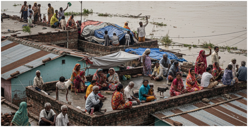Munger: In Krishna Nagar village, located in the Teliyadih Panchayat of Haveli Kharagpur block in Munger, Bihar, residents have been living in floodwaters for more than three months. Continuous waterlogging has submerged homes, forcing families to find shelter wherever possible. Those living in two-story houses have taken refuge on their rooftops, while families in small mud houses have had no choice but to cover themselves with polythene sheets in open areas. For these villagers, daily life has become a struggle for survival.