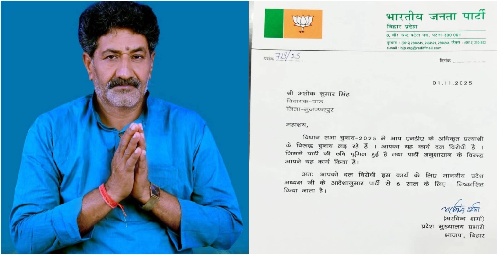 Patna: The Bharatiya Janata Party (BJP) has expelled its Paru MLA, Ashok Singh, from the party for six years. The decision was taken on charges of anti-party activities after Singh decided to contest as an independent candidate in the upcoming Bihar Assembly elections. This move is part of the BJP’s ongoing action against rebel leaders who have turned against the party ahead of the polls.