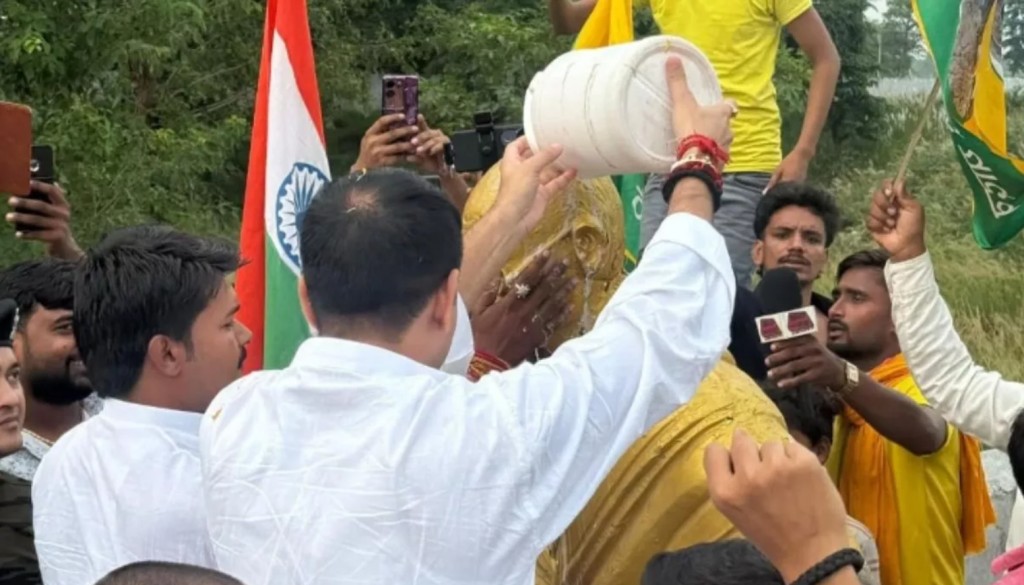 Muzaffarpur: The placing of BJP flags and a party cap on a statue of Mahatma Gandhi at a school in Bihar has triggered a political row, with opposition leader Tej Pratap Yadav responding by ritually “purifying” the statue.