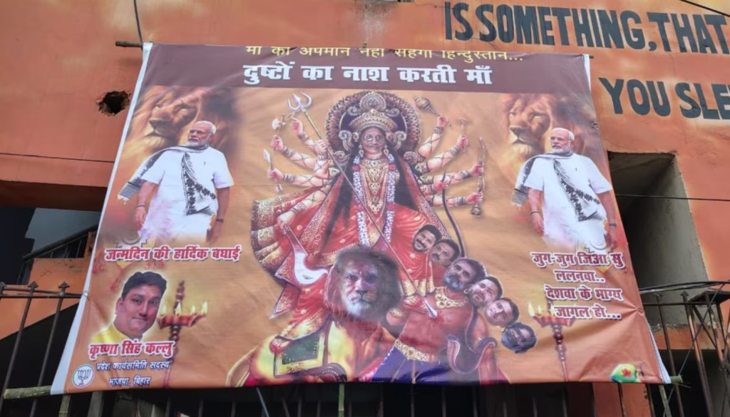 The poster, put up by Krishna Singh Kallu, a member of the BJP’s state working committee, depicts PM Modi’s late mother, Heeraben Modi, as Goddess Durga. She is shown slaying figures portrayed as Mahishasura, a demon in Hindu mythology, who in this depiction represent opposition leaders including Rahul Gandhi, Tejashwi Yadav, Akhilesh Yadav, Hemant Soren, M.K. Stalin and Revanth Reddy.