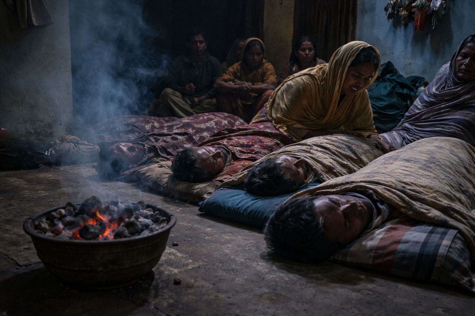 According to relatives and local officials, the family had gathered in a single room to escape the biting cold. A charcoal brazier was kept burning through the night, with doors and windows shut. As the fuel smouldered, carbon monoxide is believed to have accumulated in the room, gradually displacing oxygen.