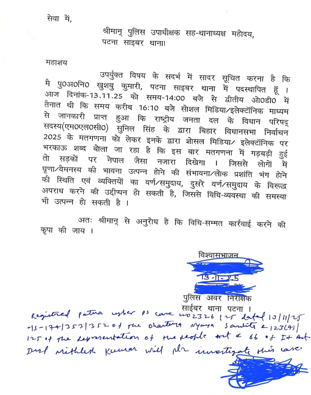 The Patna Cyber Police Station took suo motu cognizance of the statement after receiving a complaint. ASI Khushboo Kumari filed an application urging the registration of an FIR, stating that Sunil Singh’s comments were inflammatory and could incite public unrest.