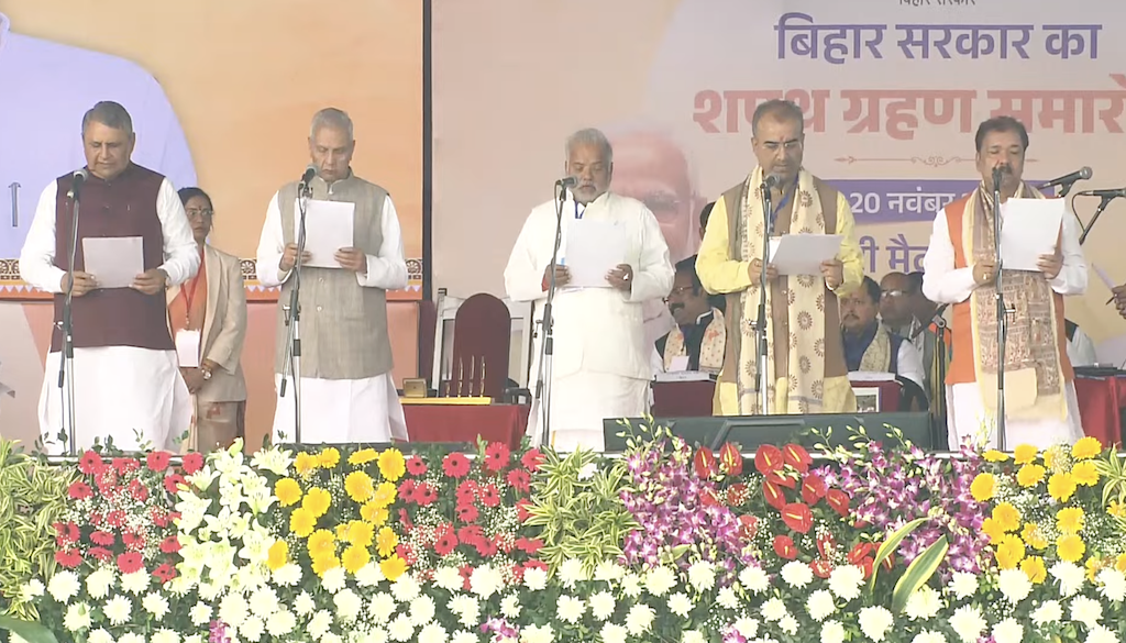 Samrat Chaudhary and Vijay Kumar Sinha were sworn in as deputy chief ministers before the induction of the JD(U) ministers, signalling continuity at the top of the coalition government.
