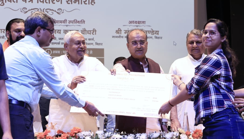The ceremony was held at Urja Auditorium in Shastri Nagar, Patna, where the chief minister symbolically handed appointment letters to select candidates, including Vinita Kumari, Swati Kumari and Roshni Kumari.