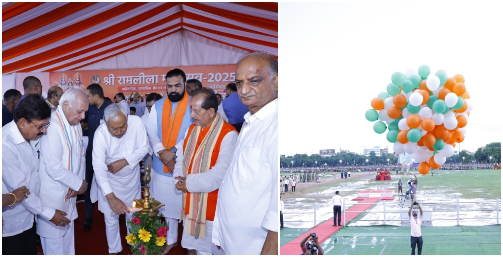 Patna: Patna celebrated Vijayadashami with great enthusiasm on Thursday as Chief Minister Nitish Kumar and Governor Arif Mohammad Khan inaugurated the Shri Ramlila Festival and Ravana Vadh Ceremony 2025 at Gandhi Maidan. The event, organised by the Shri Krishna Memorial Committee, the Department of Art, Culture and Youth, and the Shri Shri Dussehra Committee Trust, drew large crowds of devotees and spectators. The ceremony began with the lighting of a ceremonial lamp, and the Chief Minister was welcomed with a memento, a robe, and a religious book, a gesture symbolising respect and tradition.