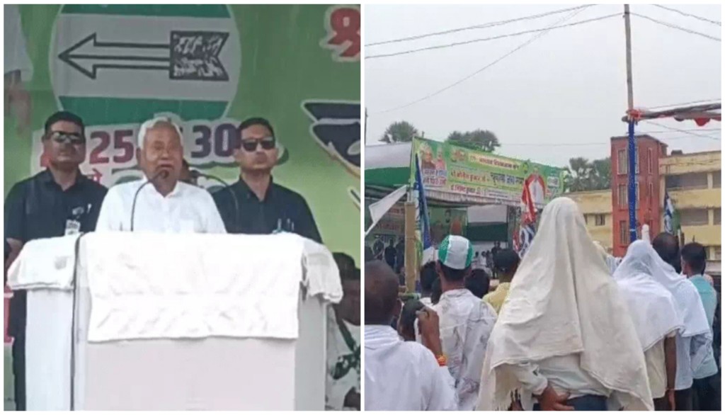 Despite heavy rain, Nitish Kumar’s meeting at Sarabahdi Hard School grounds in Rajgir drew large crowds. He urged voters to back JDU candidate Kaushal Kishore, highlighting his government’s achievements in infrastructure, health, and women’s empowerment.