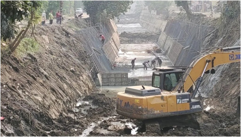 Work was halted for roughly four months during the monsoon season but resumed after the Chhath festival. So far, 60 metres of drain have been fully constructed, with the ground level cast for an additional 40 metres. The U-shaped drain is designed to be seven metres wide at the base and 12 metres at the top.