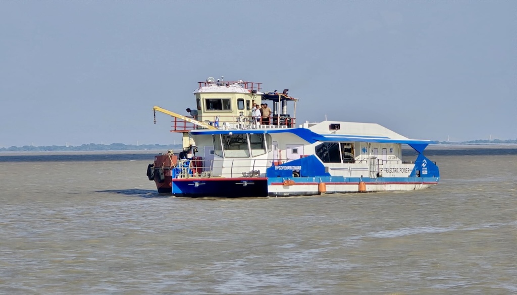 On Monday, an electric vessel named MV Gomdhar Kunwar, brought from Kolkata, completed its trial journey between Gaighat and NIT Ghat. Officials from the Inland Waterways Authority of India (IWAI), the Bihar State Tourism Development Corporation, and technical experts were on board during the test.