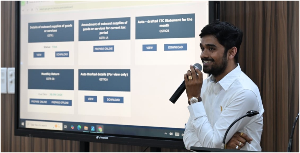 Throughout the session, CA Amit Kumar gave detailed explanations on different types of GST returns, their due dates and the online process of filing. He spoke about input tax credit reconciliation, common mistakes that businesses make, and simple strategies to avoid penalties while staying compliant. The workshop became more interesting as he included live demonstrations and case studies. This allowed students to see the process in action and understand how to handle GST returns in a real business setting.