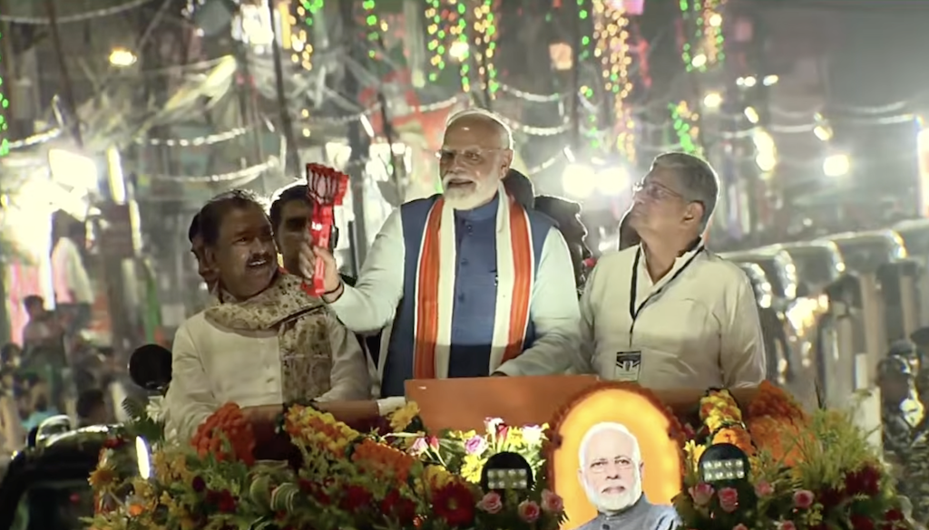 Riding in a flower-decorated vehicle, PM Modi has been joined by Union Minister Rajiv Ranjan (Lallan Singh), MP Ravi Shankar Prasad, and BJP state president Dilip Jaiswal. The Prime Minister is greeting supporters with folded hands, holding the BJP’s lotus symbol, while some residents are performing aarti from rooftops as his cavalcade passes by.