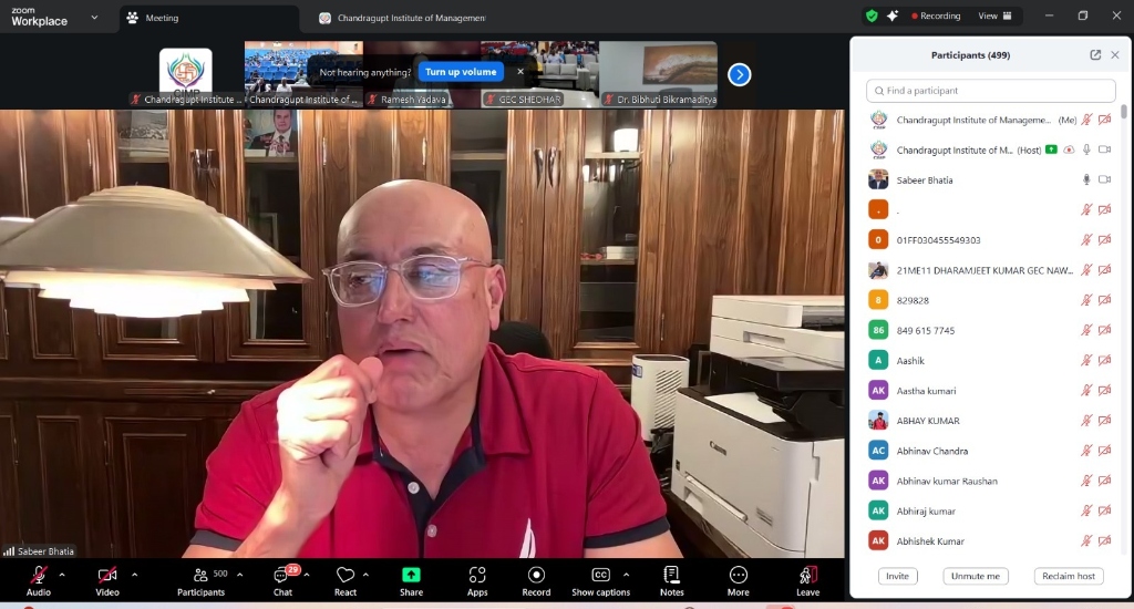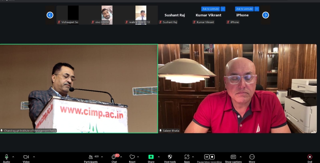 Patna: Tech entrepreneur Sabeer Bhatia, best known as the co-founder of Hotmail, addressed thousands of aspiring entrepreneurs during a virtual bootcamp organised by the Chandragupt Institute of Management Patna (CIMP) in collaboration with TiE Patna on March 12. The online session, titled “The Human Algorithm: Scaling Success from Hotmail to HotCoin”, drew around 6,000 participants including students, founders and startup enthusiasts.