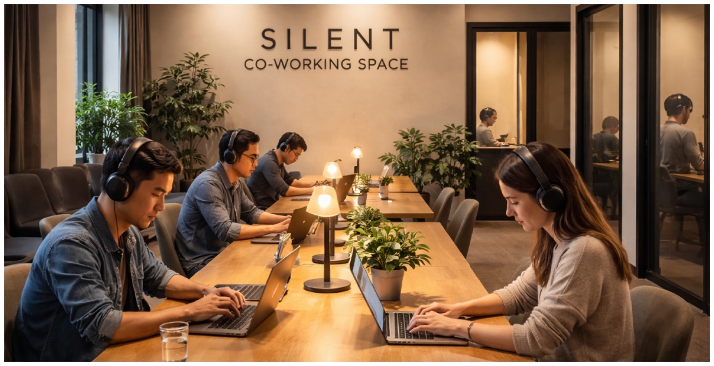 A silent co-working space is a shared workplace where silence is strictly maintained. The atmosphere is similar to a library, where everyone respects the need for quiet. People sit together in one room but do not speak to each other. Most workers wear headphones and work continuously for two to three hours at a stretch. Short breaks are taken in between sessions, but inside the main workspace, talking and phone calls are not allowed. The aim is to create a calm and distraction-free environment.